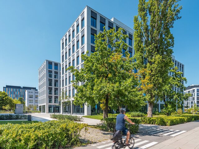 B10 is characterised by a façade in shades of grey, typical of a calm, Scandinavian-inspired design. The interiors are shaped around the everyday needs of users. The H-shaped layout, high windows and column-free spaces allow for bright, adaptable work areas tailored to multiple workplace models.